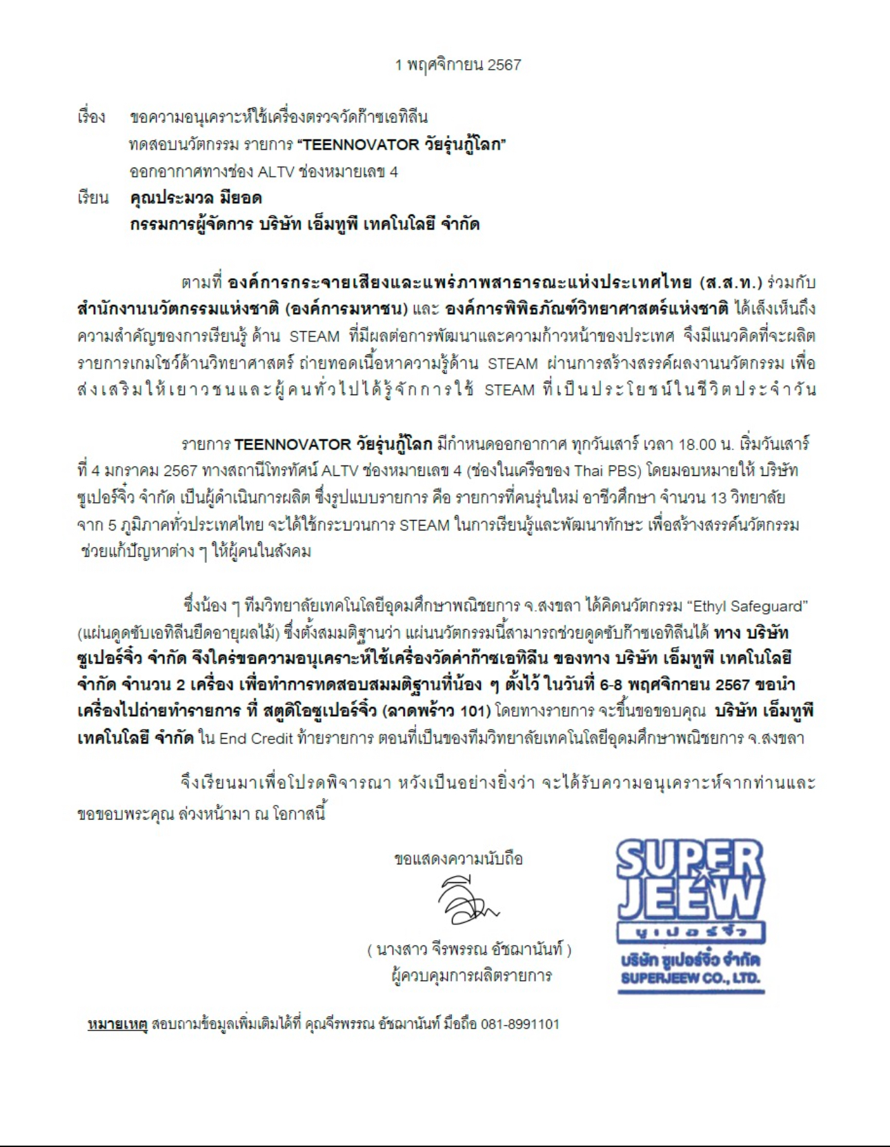 M2P Technology Co., Ltd. is proud to support science education for Thai youth by donating an Ethyl Gas Detector to Super Jeew, the most popular childrens program of all time. This device will be used during filming at the Super Jeew studio.